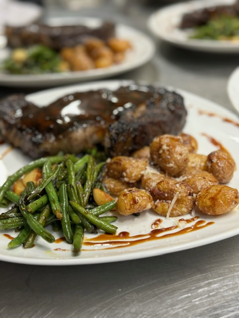 with truffle smashed potatoes and garlic string beans