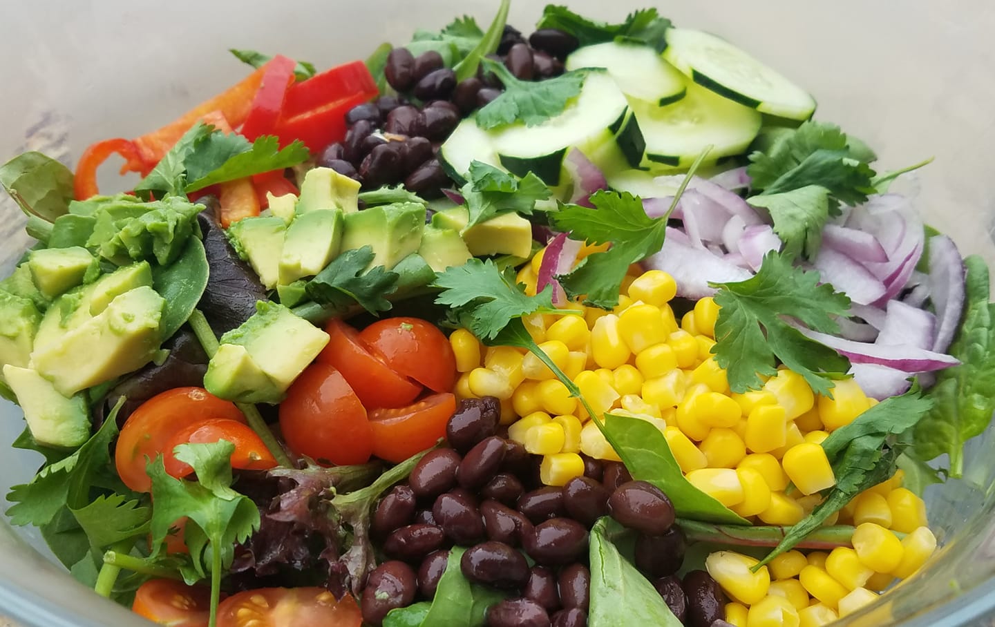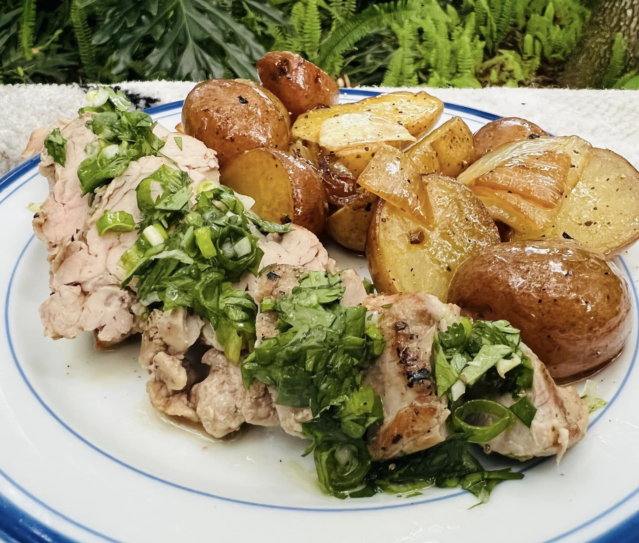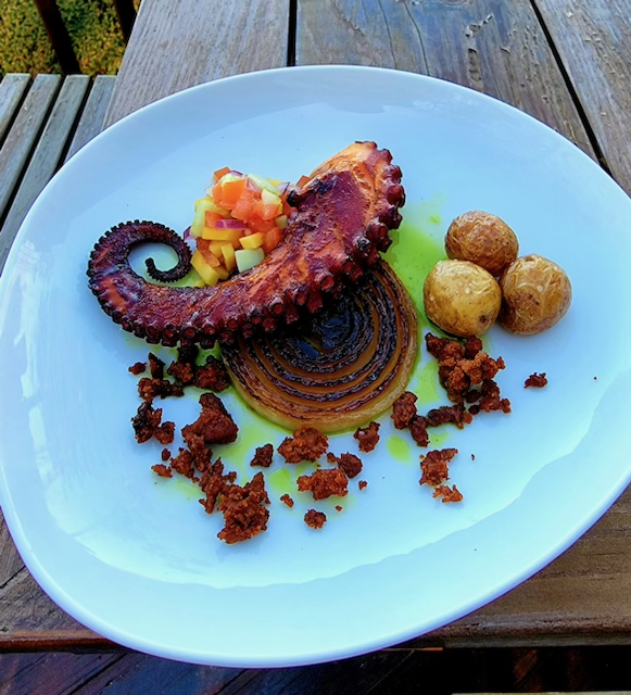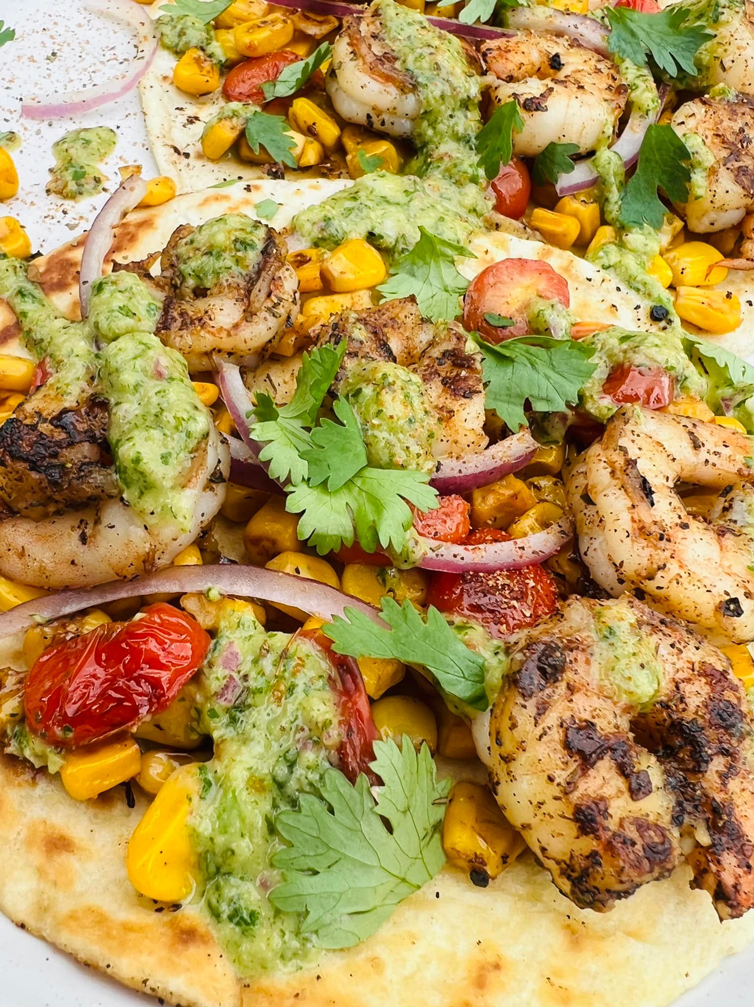 With charred sweet onion, creamer potatoes, crumbled chorizo, cilantro oil, and mango pico