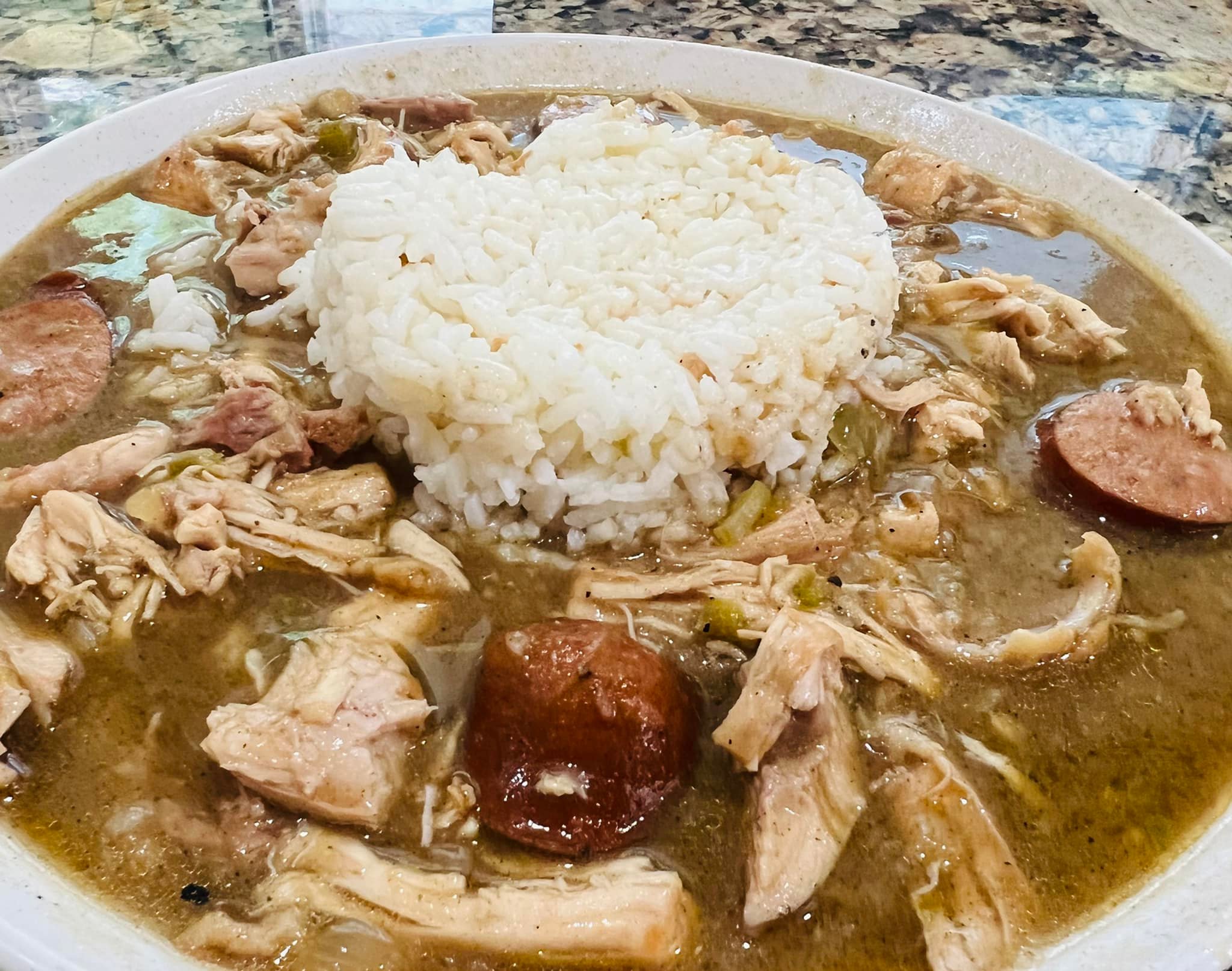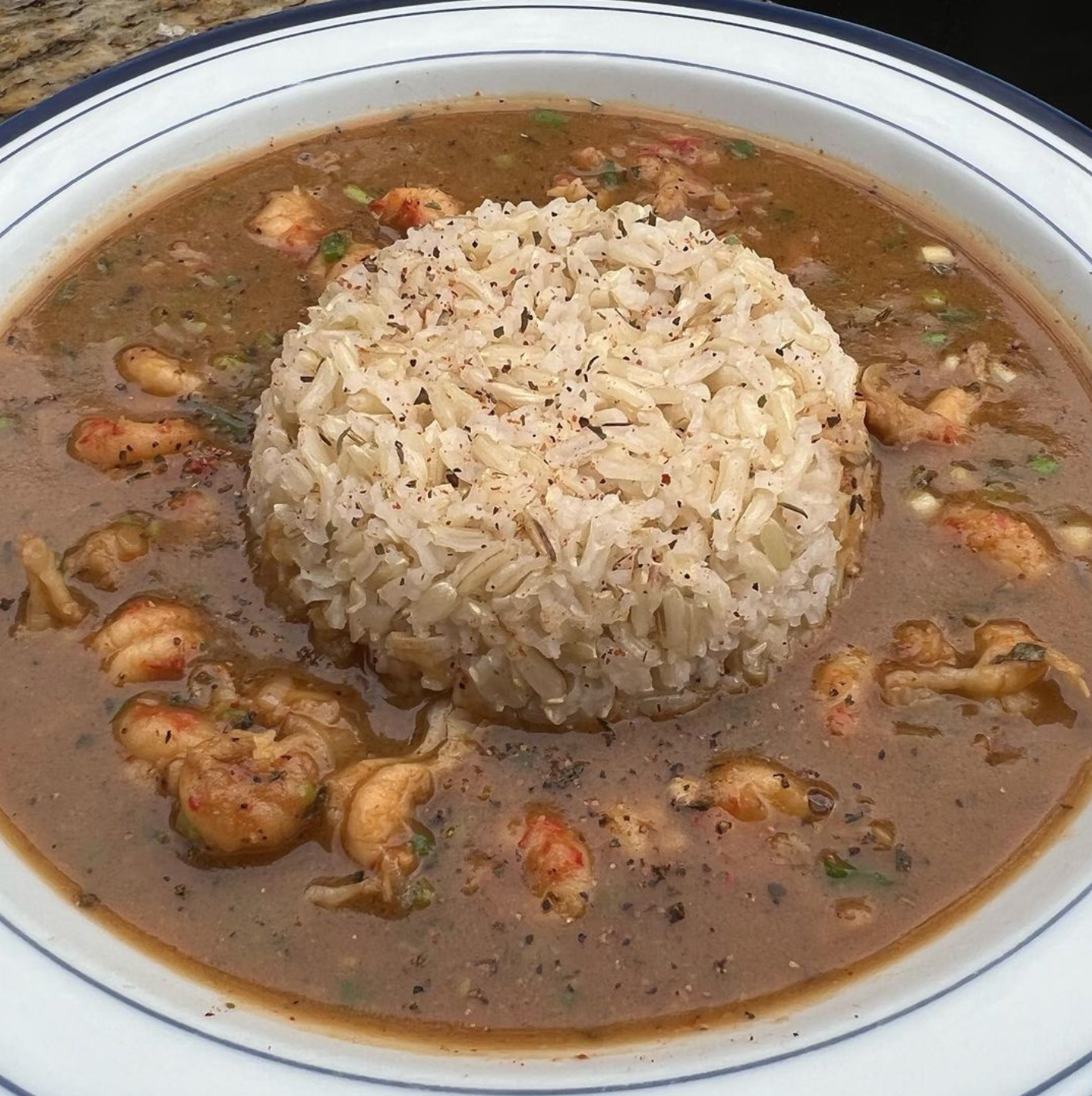 Étouffée is a dish of crawfish, simmered in a sauce made from a roux, Cajun seasonings and served over brown rice.
