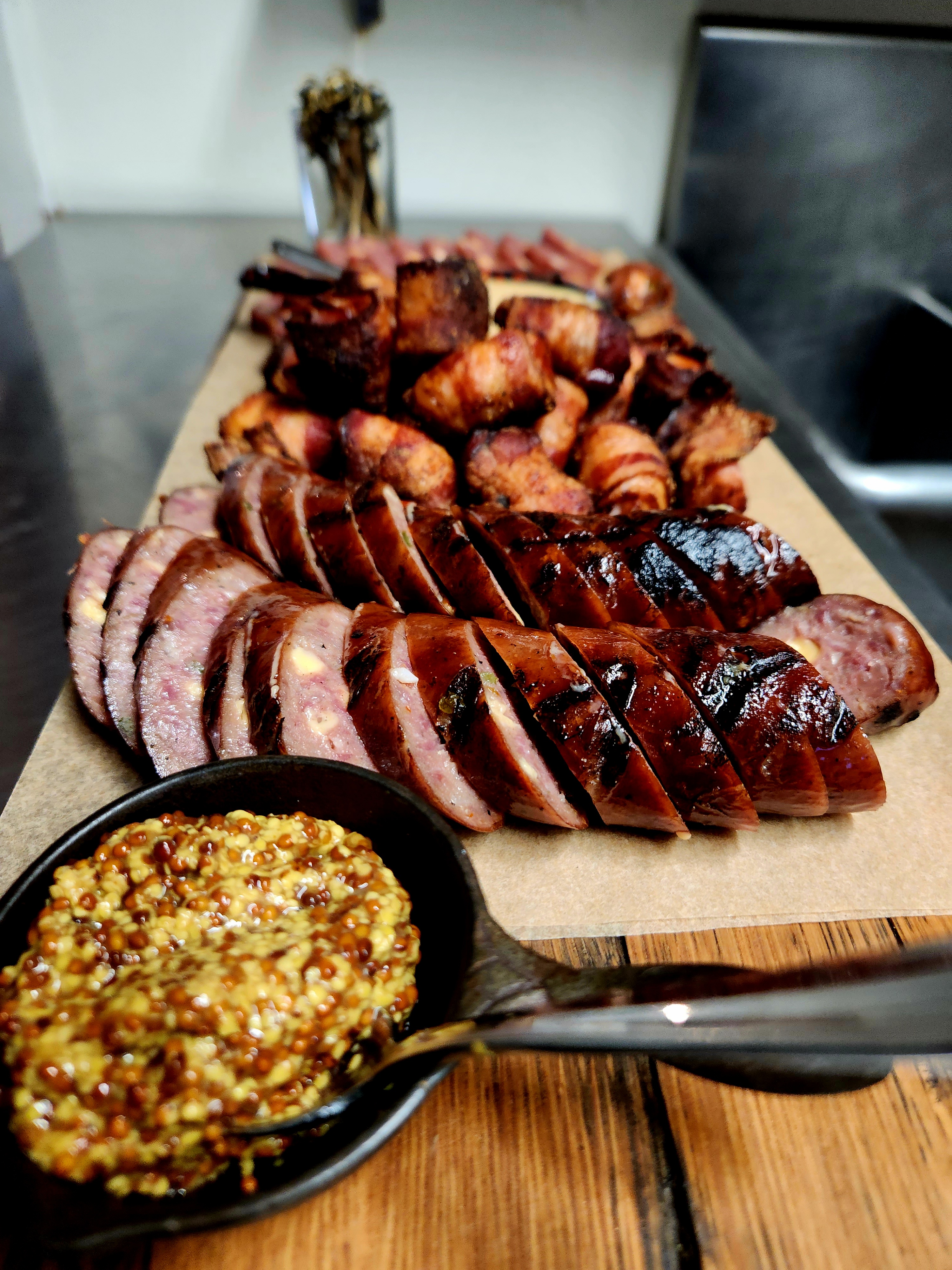 house made smoked jalapeño cheddar venison sausage and bacon wrapped quail breasts served with whole grain mustard