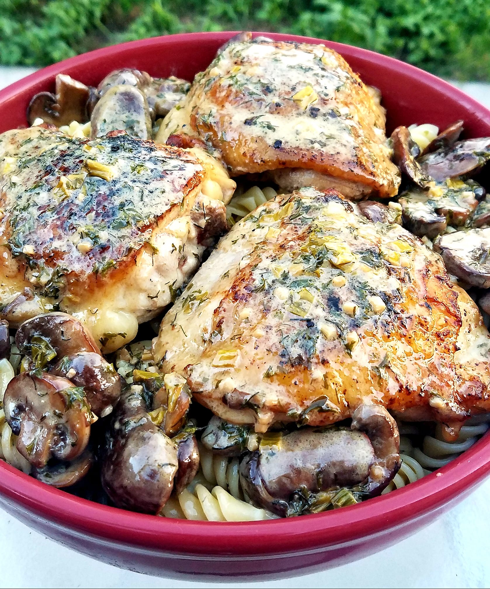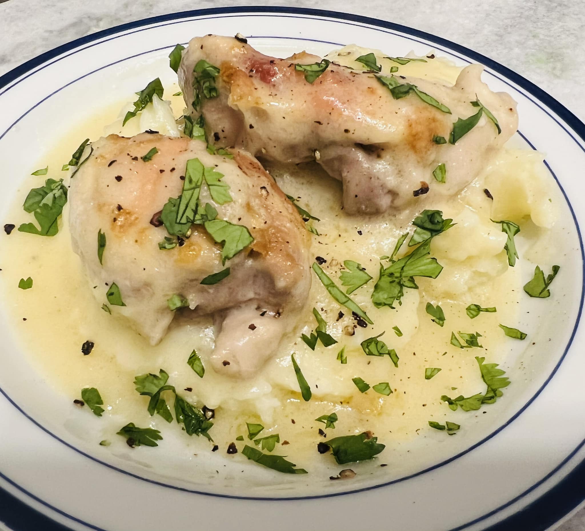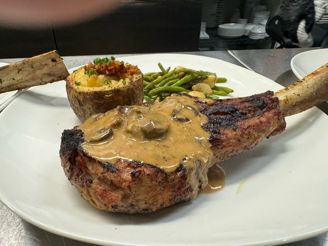 with mushroom marsala sauce, twice baked potato and green bean almondine