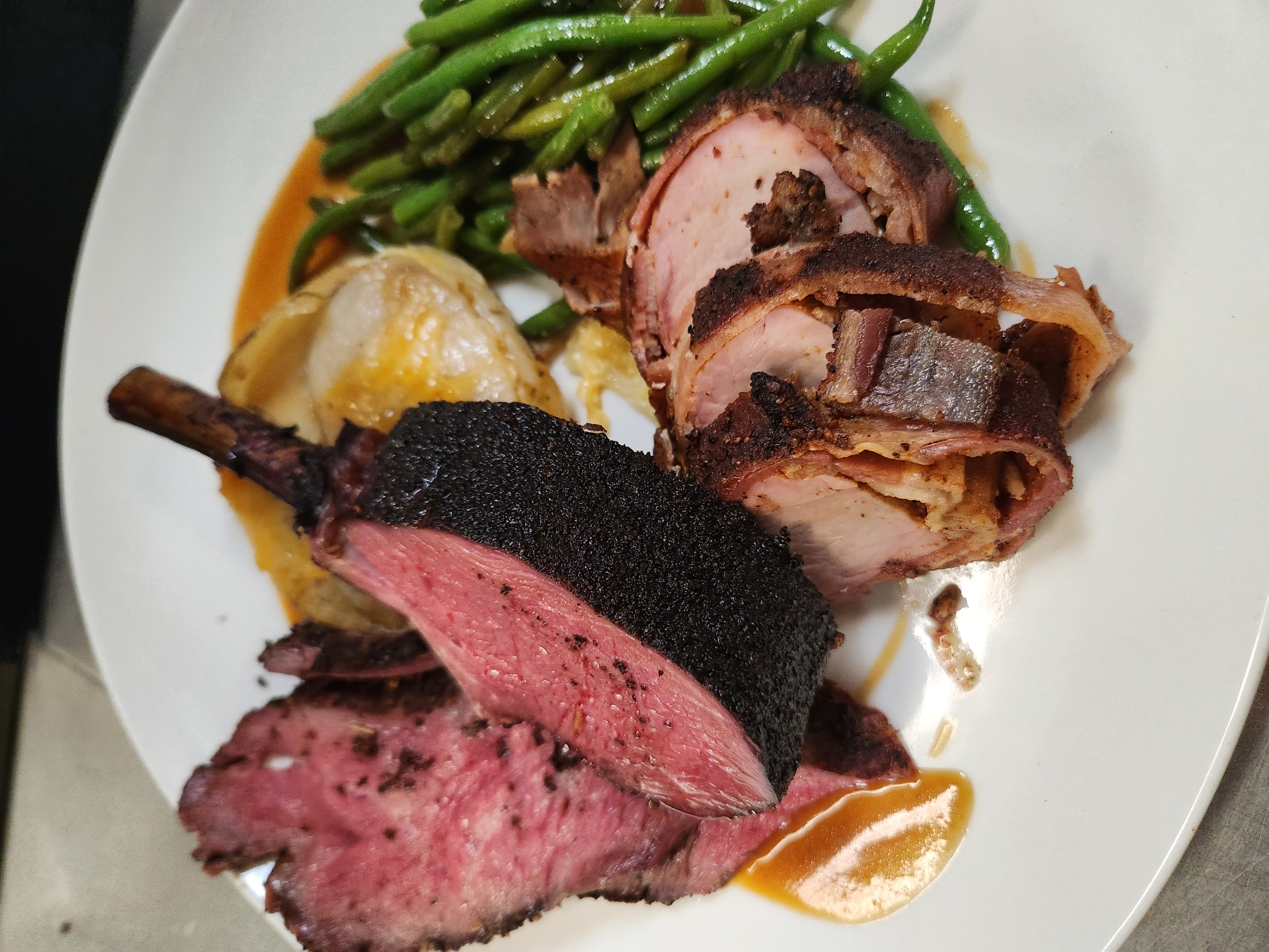 smoked elk chop featuring our Dark Horse charcoal rub with bacon wrapped wild boar tenderloin