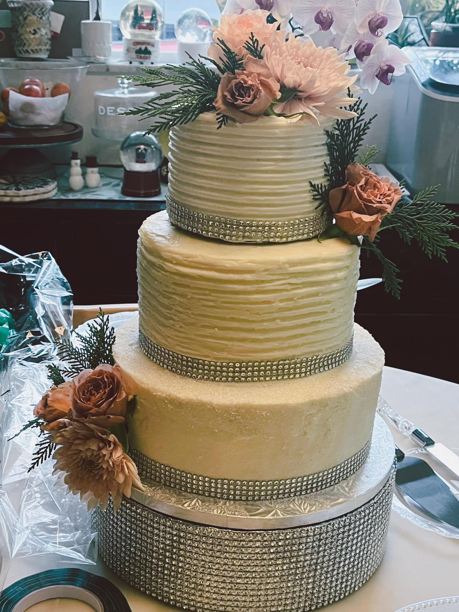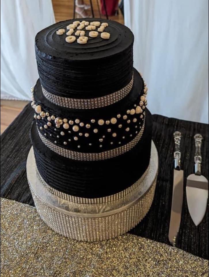 Elegant and beautiful 3 tier cake with black buttercream icing. Top layer is vanilla, middle is red velvet, and bottom layer is almond. Cake stand not included. 80 servings.