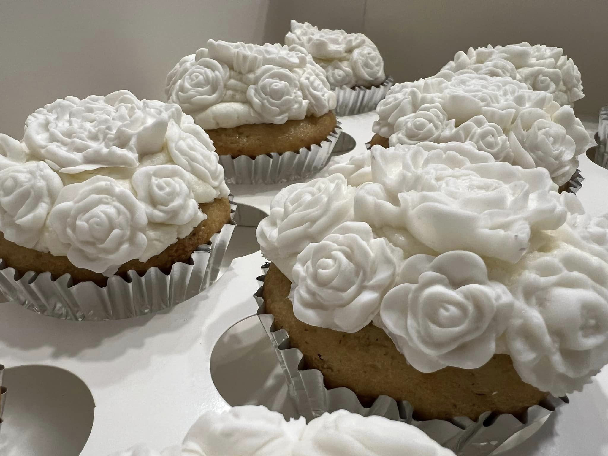 Vanilla cupcakes with white chocolate roses. Sold by the dozen.