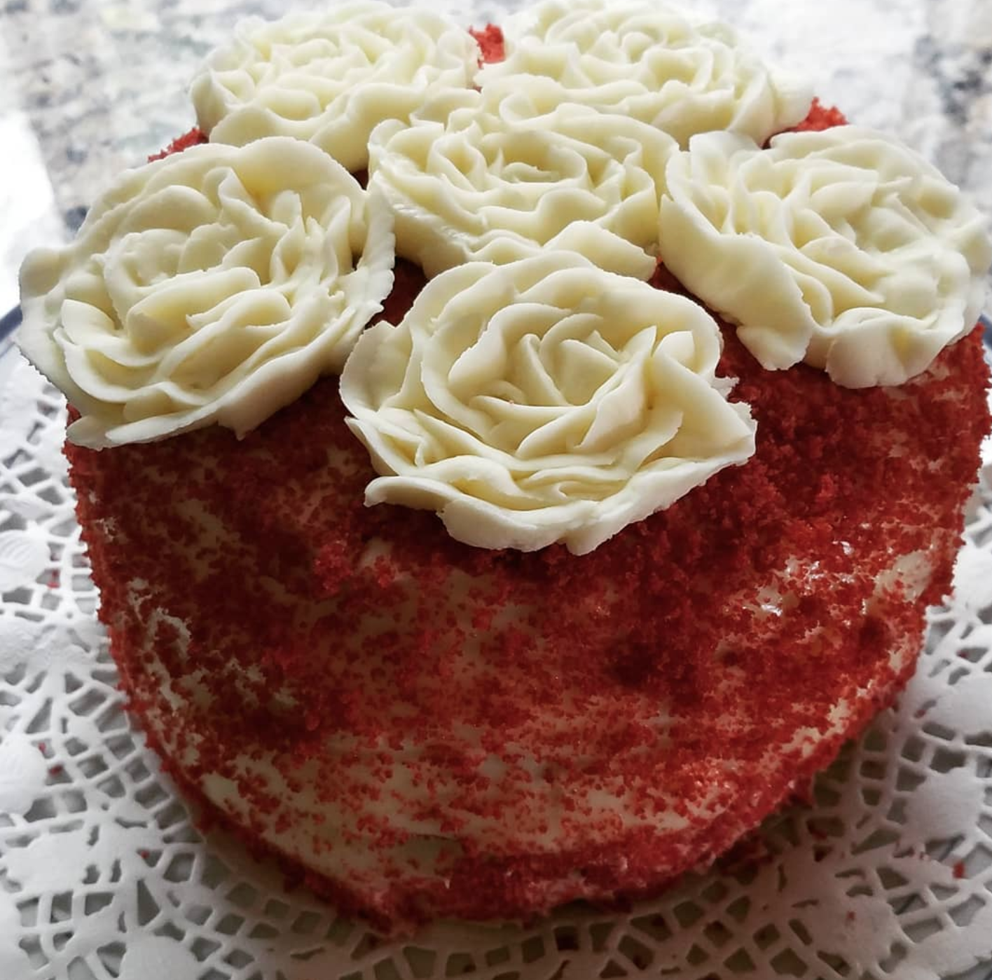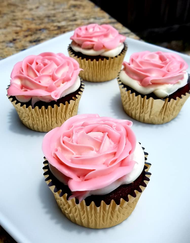 Red velvet cupcakes with beautiful buttercream roses.
