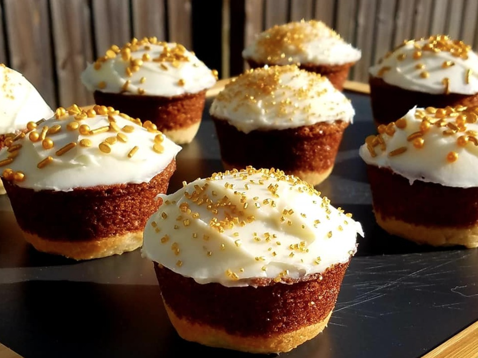 Red velvet and vanilla cupcakes with black buttercream icing and sprinkles. Sold by the dozen.