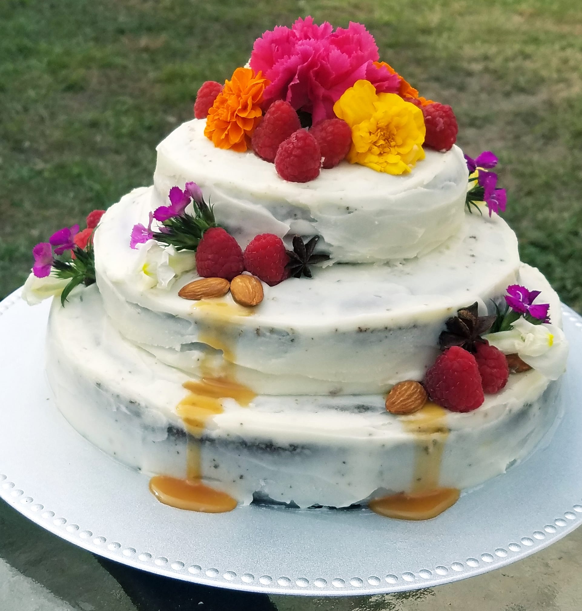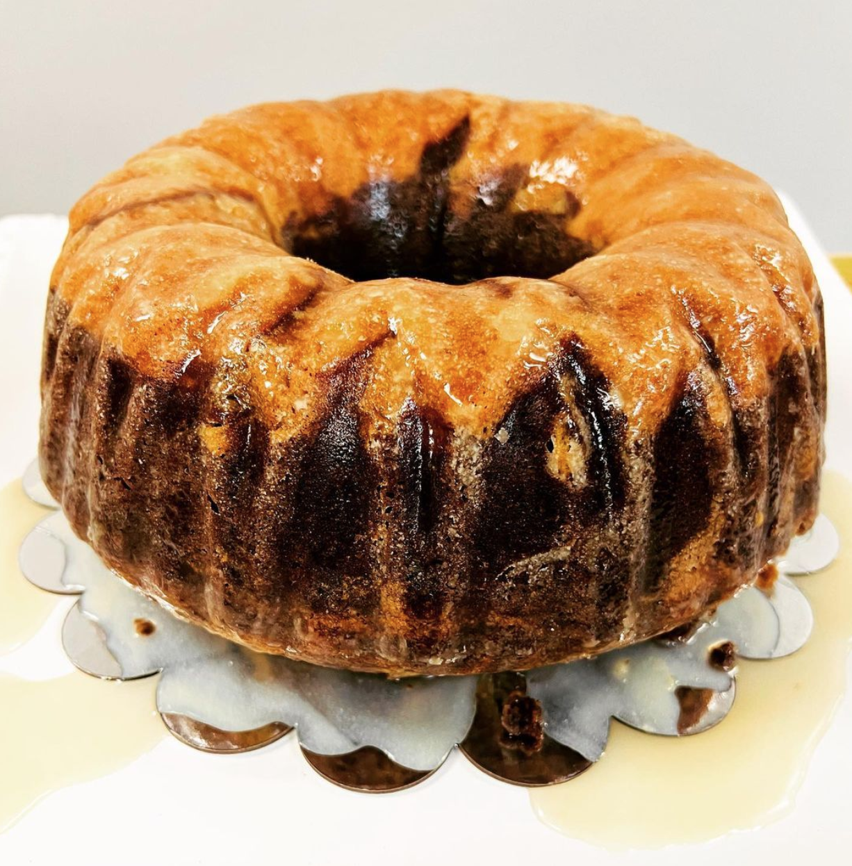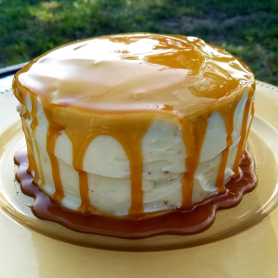 Carrot cake with cream cheese buttercream frosting and caramel rum glaze.