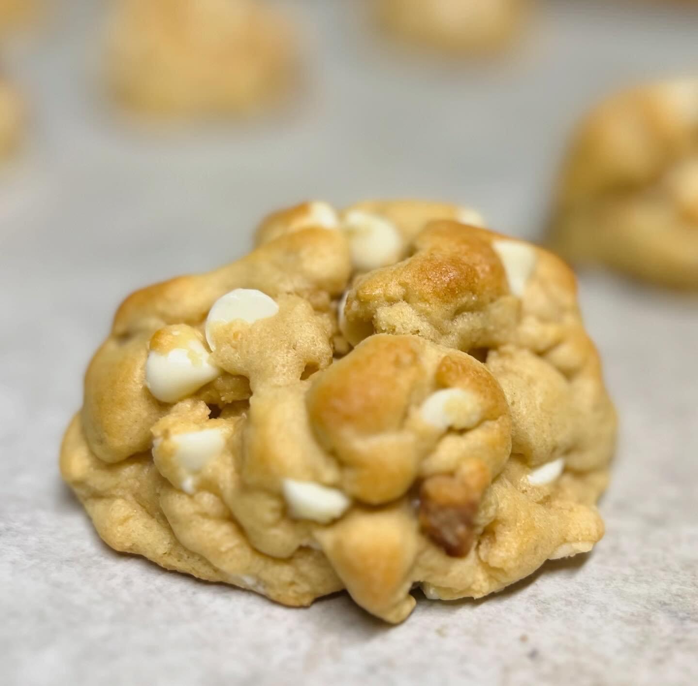 Packed with white chocolate chips & chopped macadamia nuts! Over the top cookie with fantastic flavor, buttery crisp edges and a soft & chewy center.