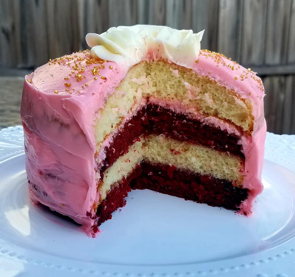 Red Velvet & Vanilla Cake with Strawberry filling and buttercream.